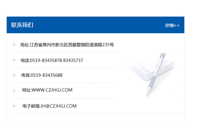 地址:常州市新北區友邦商務大廈1幢16、17層  電話:0519-85101652  傳真:0519-85112595  郵編:213022  網址:www.cz-jiayue_cn.ynjfgc.com  郵箱:xiajifengaa@163.com
